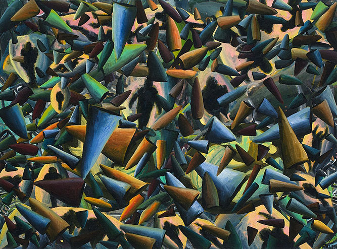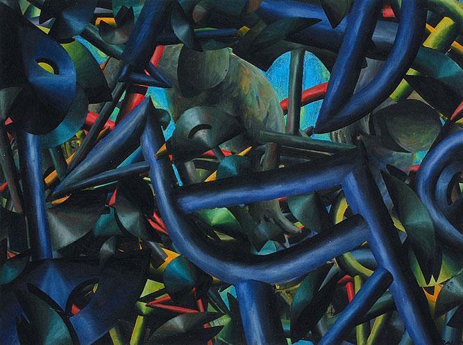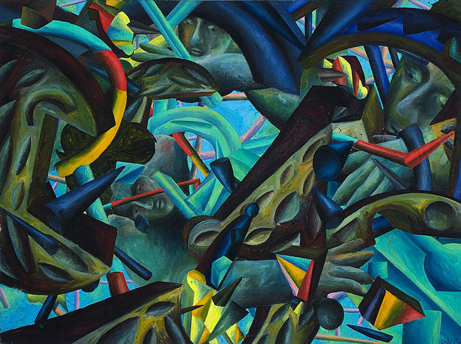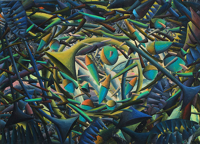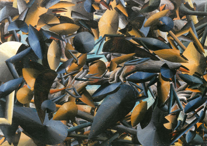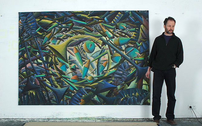 Konkrete, aber nicht eindeutig benennbare Gegenstände schweben langsam über die Bildfläche. Manche drehen sich im Kreis über einem nicht definierbaren Zentrum. Wäre der Betrachter ein Taucher, würde er Dinge sehen, die er noch niemals gesehen hat. Ein Wiener Galerist, dem ich die Bilder zeigte, glaubte sich „… in die Sekunde nach dem Urknall…“ versetzt.