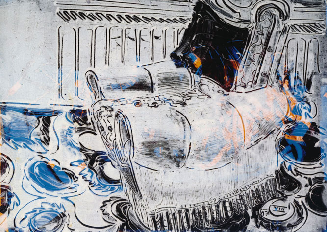 denen eine Glasplatte als einmaliger Druckstock verwendet wird.